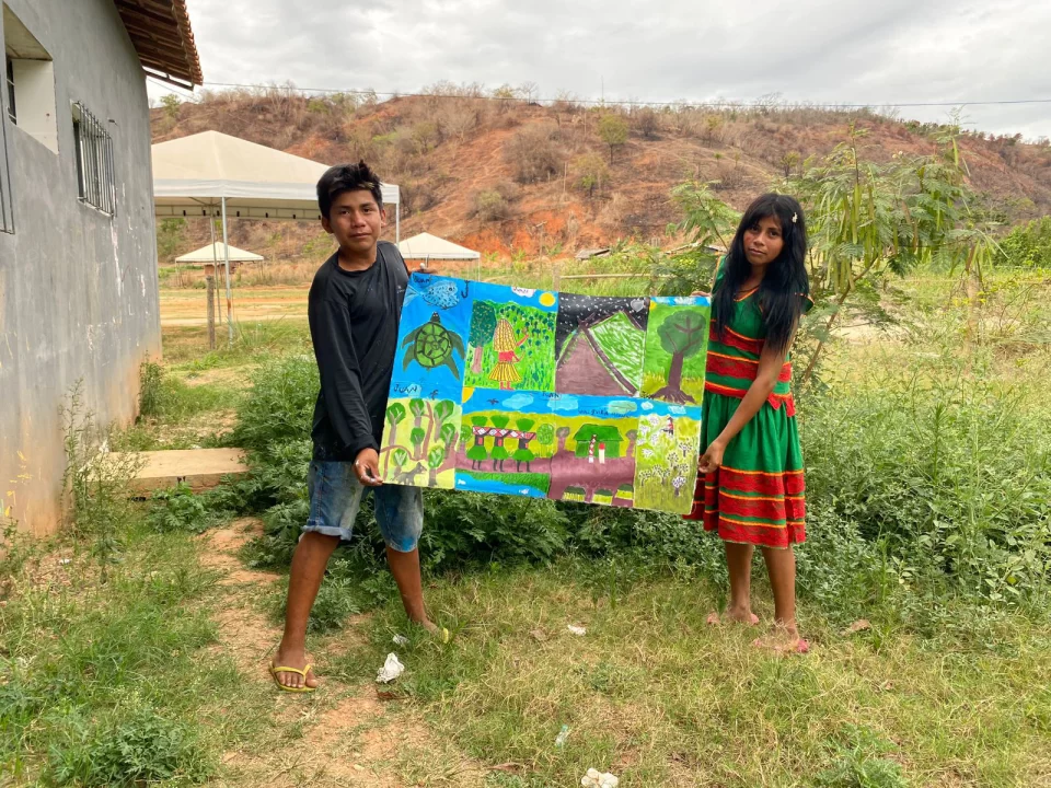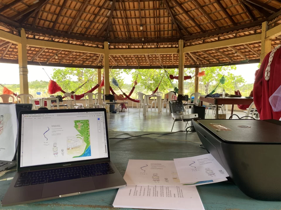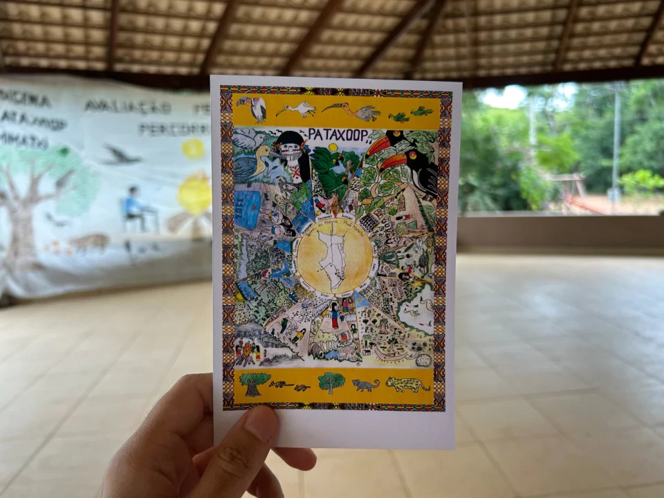 Oficina editorial para professoras e professores Pataxoop na aldeia Muã Mimatxi, organizada pelo projeto Saberes Indígenas na Escola (MEC/UFMG) que fomenta a formação continuada de educadores indígenas que atuam na Educação Escolar Indígena, com um olhar especial para a produção de recursos didáticos e pedagógicos. Neste encontro, demos continuidade à produção dos futuros livros previstos no plano editorial Pataxoop, e produzimos coletivamente um livreto e um cartão postal, apresentando a aldeia e a cosmologia pataxoop, a serem distribuídos às pessoas que visitam a aldeia.