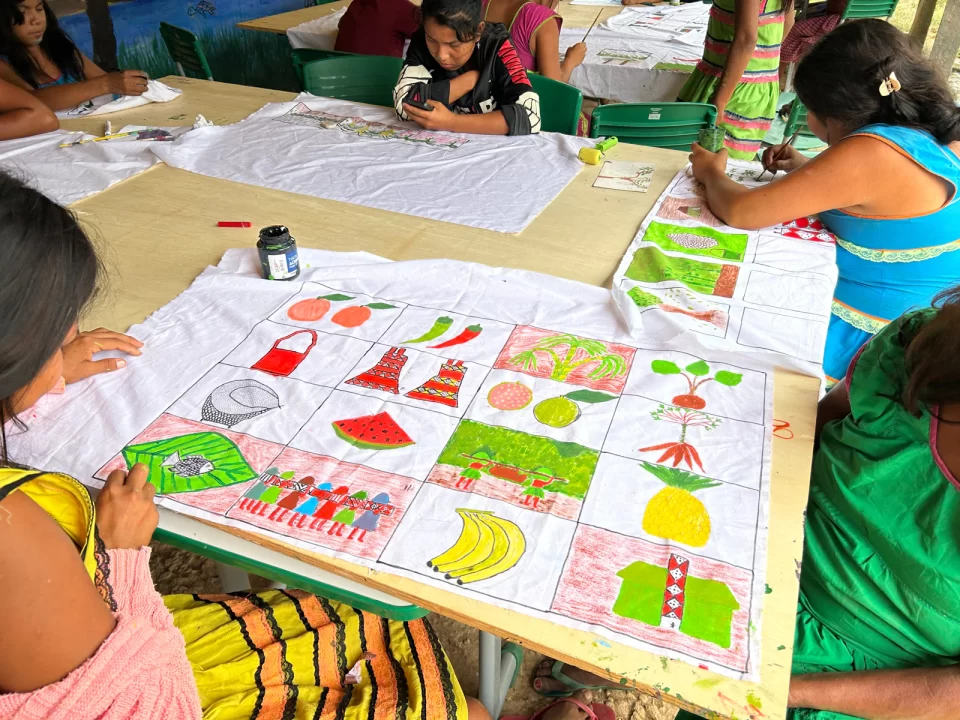 Parte do projeto desenvolvido pelo programa Saberes Indígenas na Escola (MEC/UFMG), a oficina teve o objetivo de coletivizar a produção do material didático Hãmxa tu pip xop – O que tem na roça, a ser distribuído nas escolas maxakali, composto por uma coleção de cartões ilustrados pelos Maxakali, documentando as espécies vegetais encontradas nas aldeias. A oficina, realizada na Aldeia-Escola-Floresta, consistiu em intervir coletivamente em 100 unidades de tecido, que foram pintadas pela comunidade e usadas para embrulhar as publicações, da mesma forma usada pelos Maxakali para transportar a embaúba.