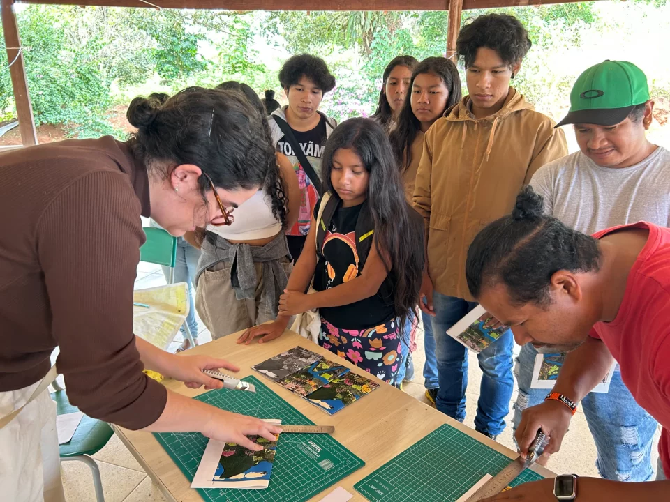 Cosmopolíticas editoriais desenvolve também oficinas editoriais em aldeias, promovendo a criação coletiva de publicações que emergem diretamente das experiências, saberes e vozes envolvidas. Essas oficinas são espaços de troca e escuta, onde o fazer gráfico é entendido como ferramenta de autonomia, memória e resistência. Com um olhar contracolonial, o estúdio busca romper com narrativas hegemônicas e abrir caminhos para formas próprias de contar, registrar e imaginar o mundo, fortalecendo as expressões gráficas e culturais dos povos originários.
