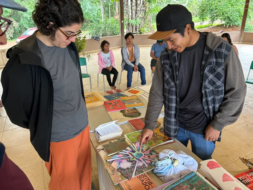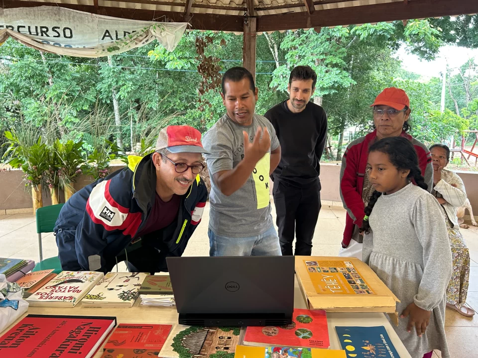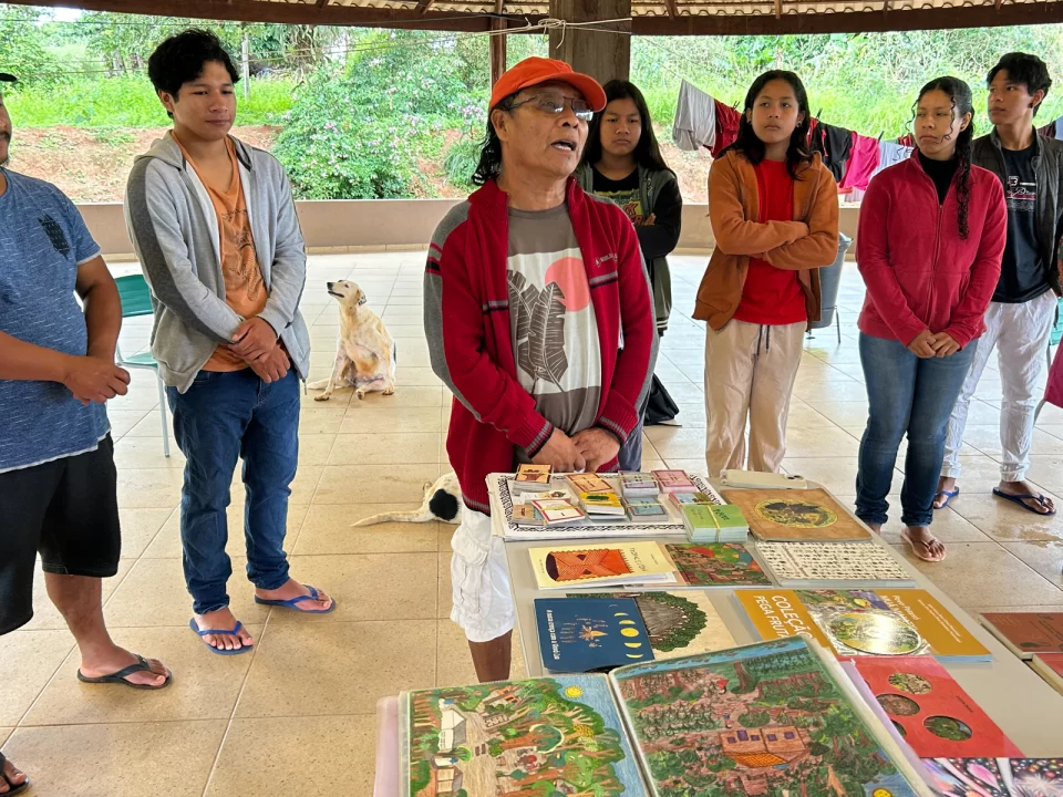 Oficina editorial para professoras e professores Pataxoop na aldeia Muã Mimatxi, organizada pelo projeto Saberes Indígenas na Escola (MEC/UFMG) que fomenta a formação continuada de educadores indígenas que atuam na Educação Escolar Indígena, com um olhar especial para a produção de recursos didáticos e pedagógicos. Neste encontro, a comunidade apresentou as publicações realizadas por ela ao longo dos anos, e viu diversas possibilidades gráficas e materiais para a produção de outros livros. No final, produziu-se coletivamente um plano editorial Pataxoop para 2025, contendo os desejos de publicações futuras para a escola da aldeia.