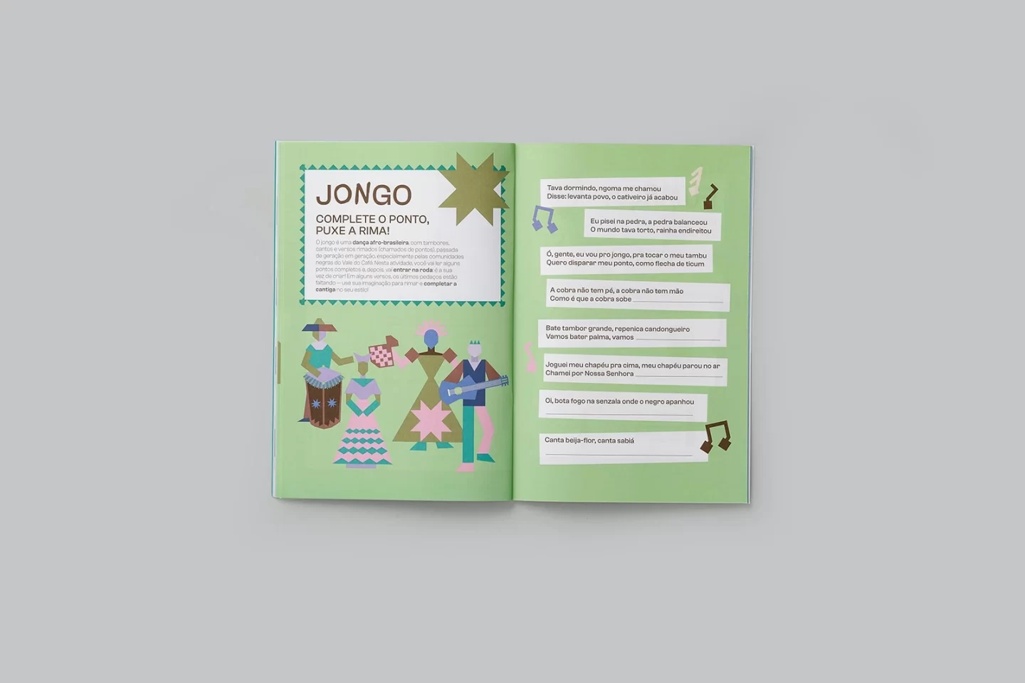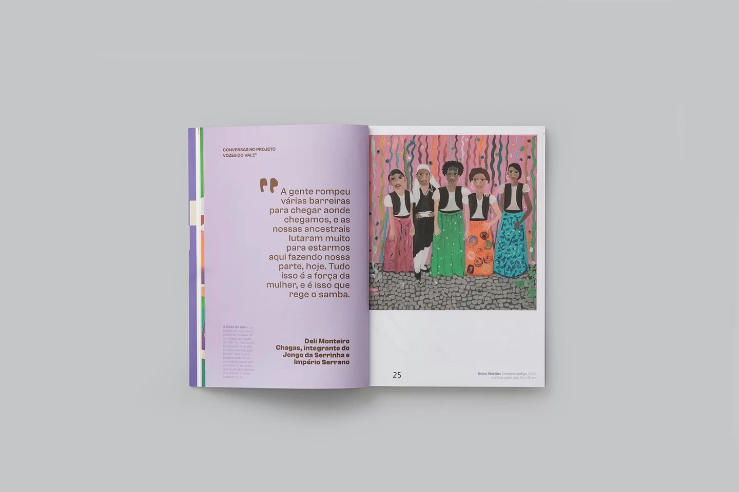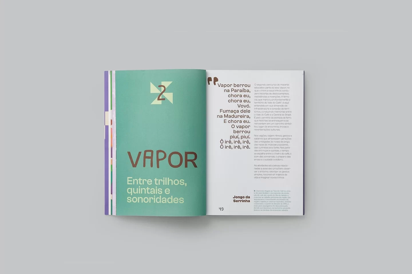 Chegança é a exposição de inauguração do Museu Vassouras (RJ), que marca uma entrada que se faz com respeito, atenção, cantos, festas e memórias. Ela procura evidenciar a relação da arte com a região do Vale do rio Paraíba e, com isso, ouvir histórias, perceber a importância de protagonistas que vivenciam o tempo e valorizar aqueles que sempre estiveram e ainda estão produzindo cultura na região. Composto por dois volumes – um destinado aos professores e outro aos alunos – o material educativo Pedir licença oferece conteúdos para uso em sala de aula e para se construir conhecimento com o corpo inteiro. As atividades educativas que acompanham as publicações são pensadas como um percurso: um convite a fazer junto, escutar, experimentar, cantar, olhar para o entorno e se reconhecer nas histórias.