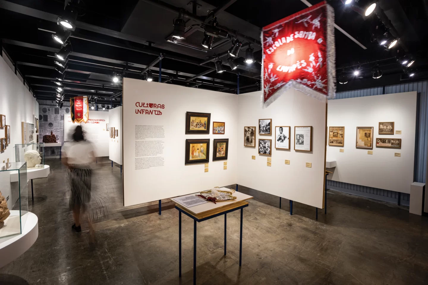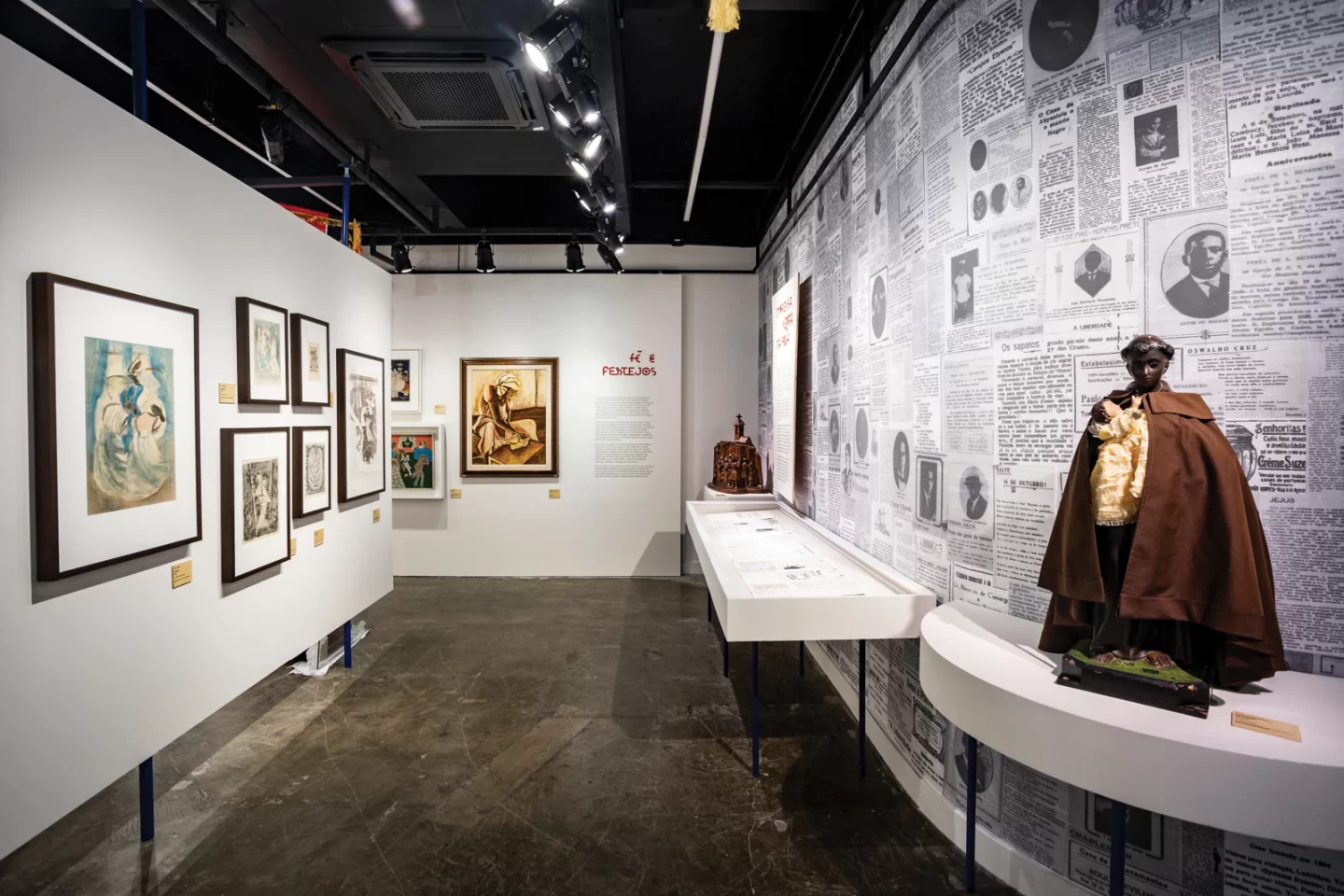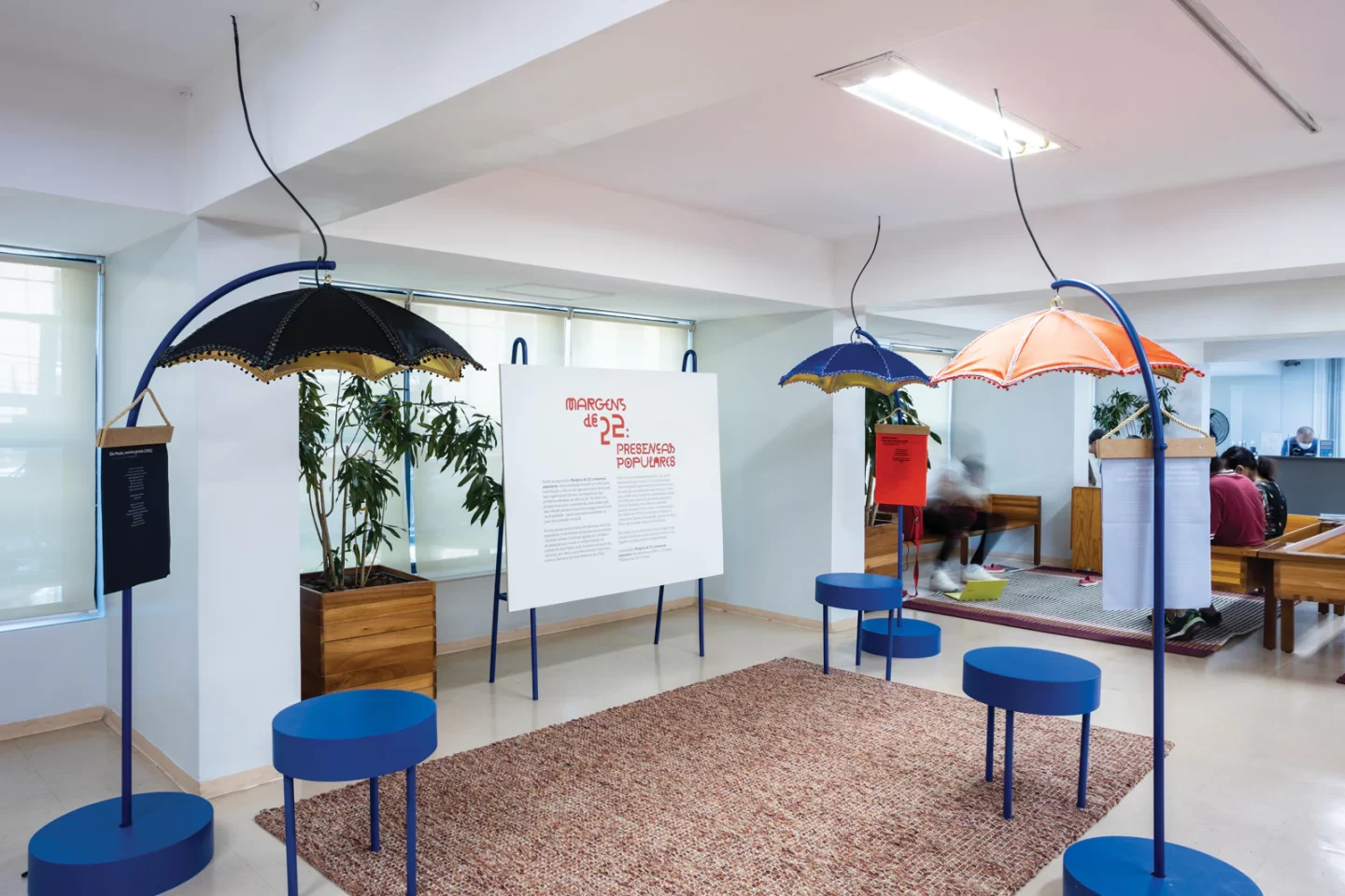 Em cartaz no Sesc Carmo, em São Paulo, a exposição Margens de 22: presenças populares reuniu materiais históricos e obras atuais que buscam reconstruir o ambiente urbano e cultural que se apresentava durante – e à margem – da Semana de Arte Moderna de 1922. Partindo da ideia de multiplicidade de experiências encontradas em um percurso pela rua, a identidade visual da exposição se configura um território gráfico que dialoga com as temáticas abordadas pelo conjunto de obras. Junto com uma paleta de cores inspirada pelas religiões de matriz africana, a tipografia utilizada materializa a ideia de movimento, ritmo e diversidade, destacando a inventividade da vida urbana periférica que emergia durante a modernidade paulistana.