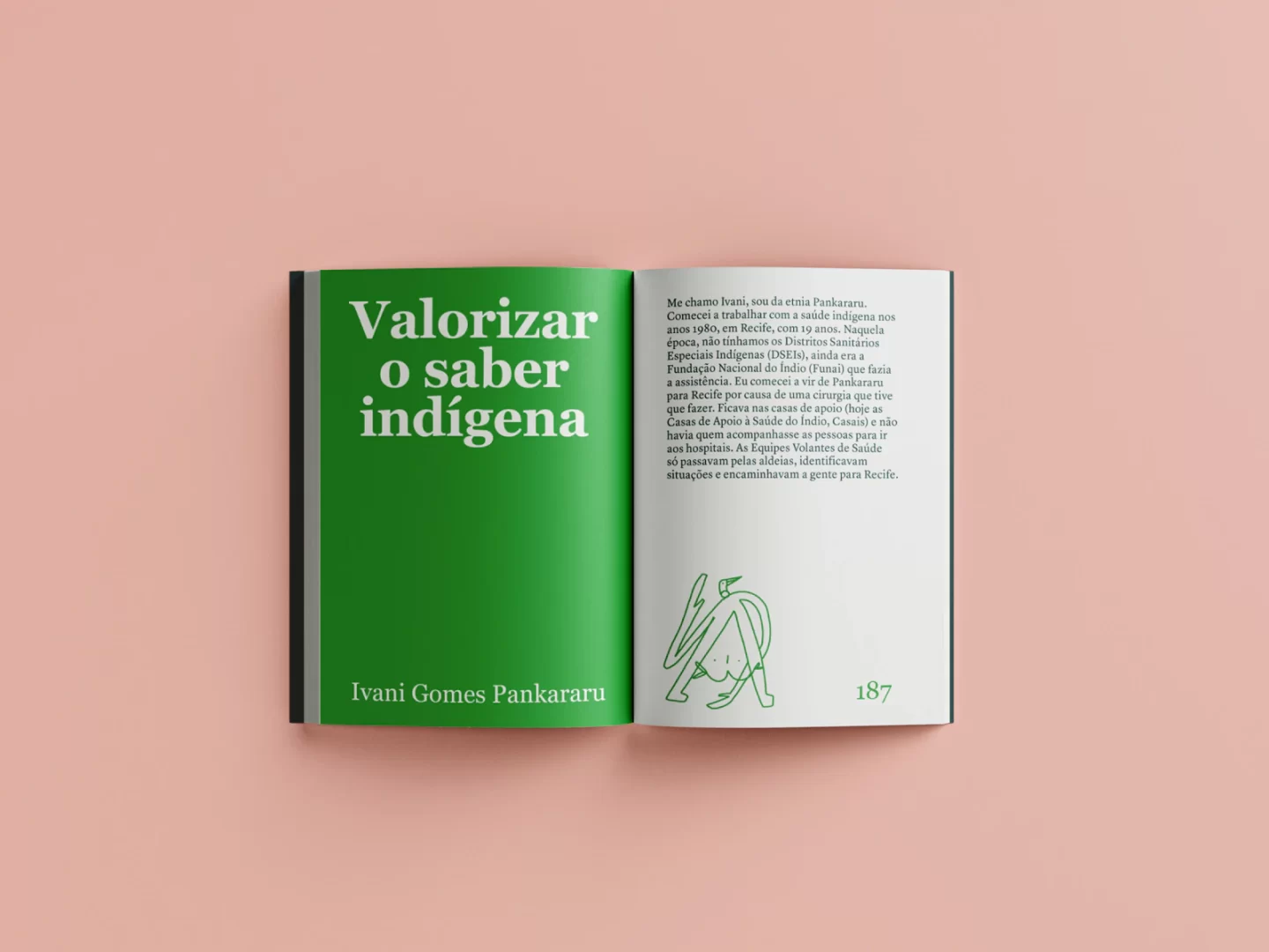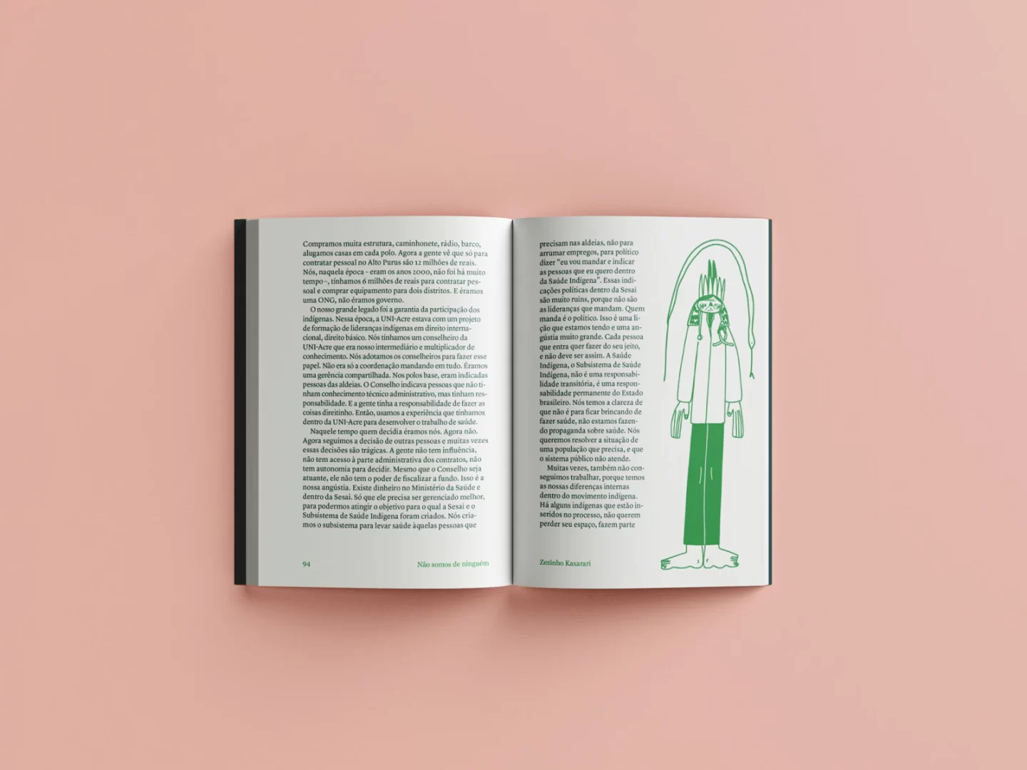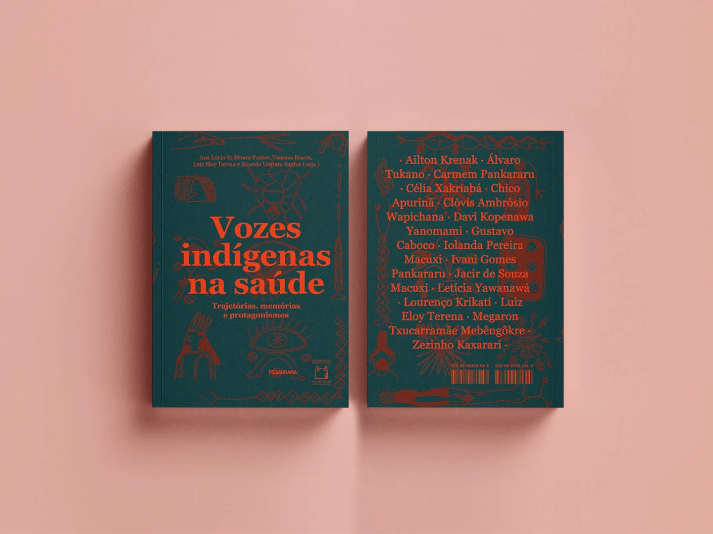 Realizado em co-edição entre a Piseagrama e a Editora Fiocruz, Vozes Indígenas na Saúde: trajetórias, memórias e protagonismos é uma coletânea de depoimentos de lideranças indígenas de diversos povos e regiões do Brasil, que resgatam a história da atuação do movimento indígena e seu protagonismo na implementação da atual política de saúde para os povos originários. Para cada capítulo da coletânea, um tom diferente de verde foi usado, evidenciando a diversidade tanto da floresta quanto dos povos que dela vivem, demonstrando a estreita ligação entre as suas práticas de cuidado e o território. Além disso, os textos são acompanhados por desenhos do artista wapichana Gustavo Caboco, que nos conduzem pelas muitas confluências e caminhos que os saberes de cura pressupõem.