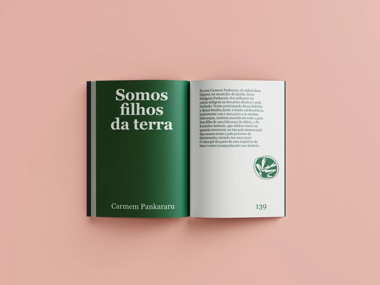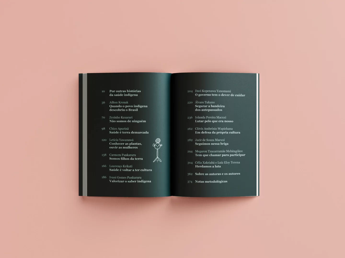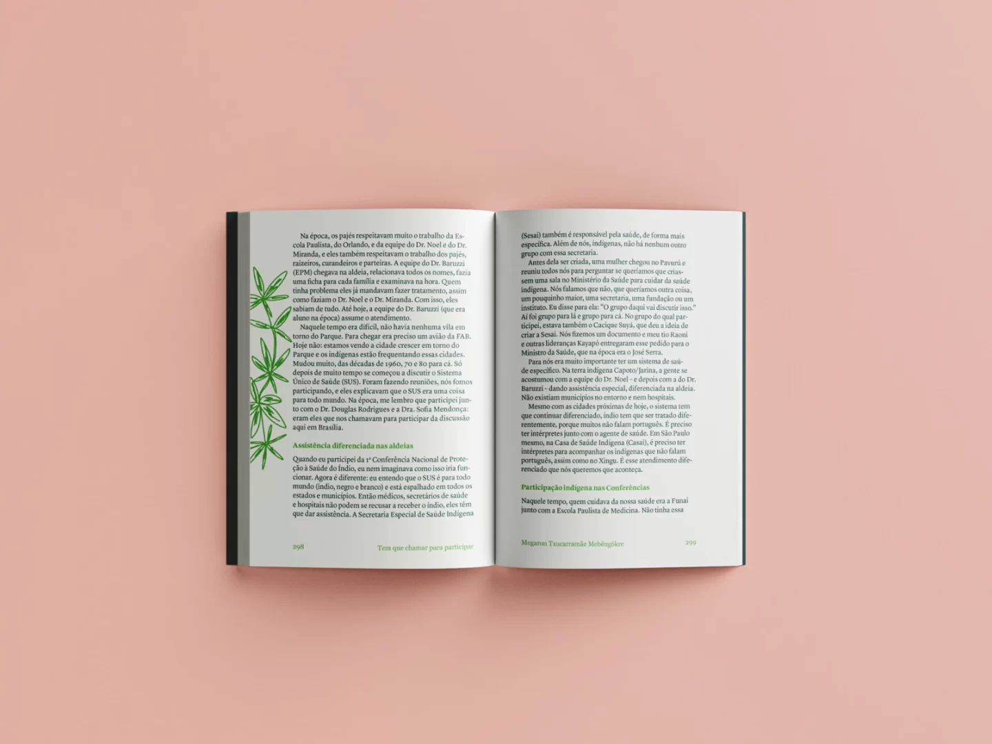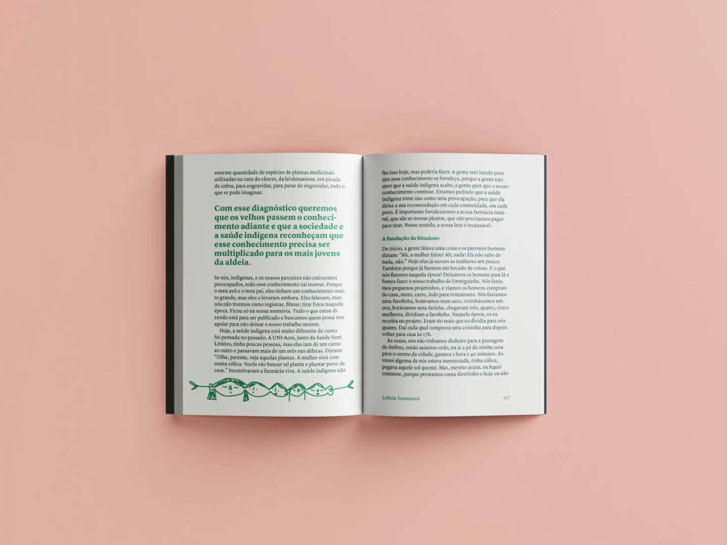Realizado em co-edição entre a Piseagrama e a Editora Fiocruz, Vozes Indígenas na Saúde: trajetórias, memórias e protagonismos é uma coletânea de depoimentos de lideranças indígenas de diversos povos e regiões do Brasil, que resgatam a história da atuação do movimento indígena e seu protagonismo na implementação da atual política de saúde para os povos originários. Para cada capítulo da coletânea, um tom diferente de verde foi usado, evidenciando a diversidade tanto da floresta quanto dos povos que dela vivem, demonstrando a estreita ligação entre as suas práticas de cuidado e o território. Além disso, os textos são acompanhados por desenhos do artista wapichana Gustavo Caboco, que nos conduzem pelas muitas confluências e caminhos que os saberes de cura pressupõem.